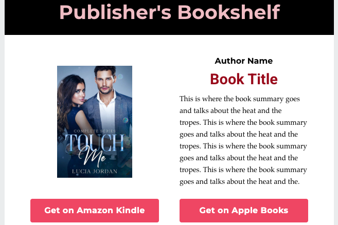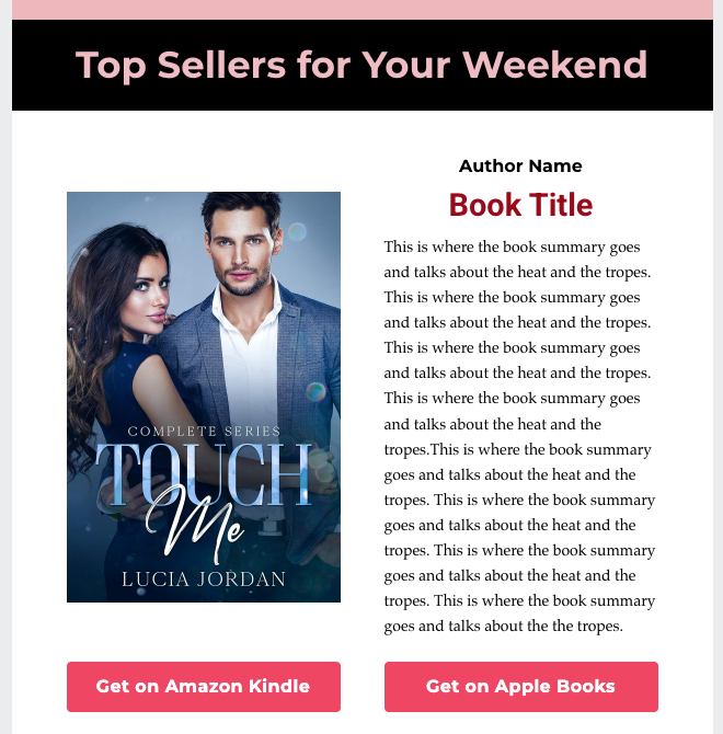 The entire newsletter dedicated to your book and sent to 36,000 romance readers! Includes extra-large cover image, long-form synopsis, and high-rating reviews from the Amazon or Apple listing.